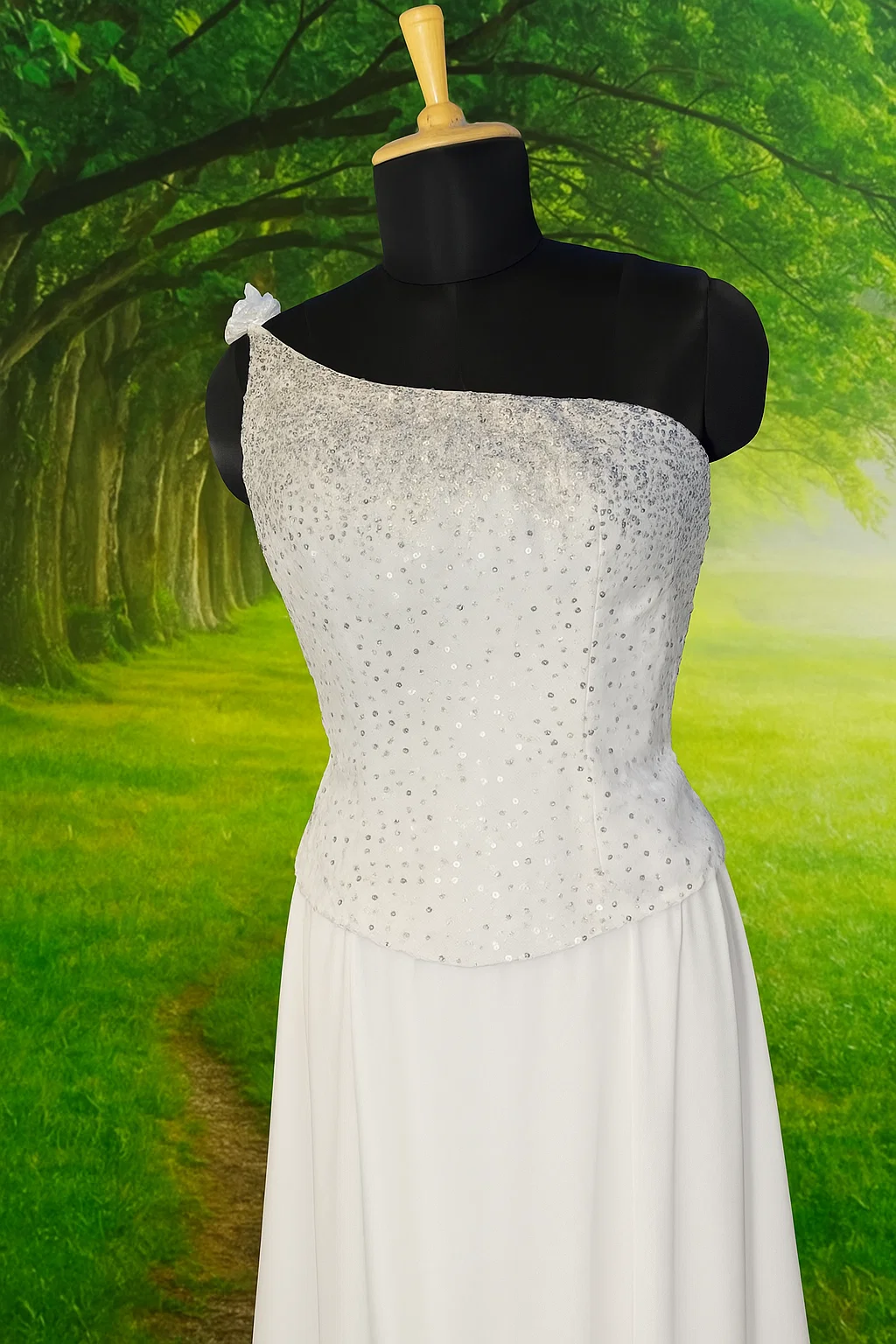 - one off shoulder design with flower on one side