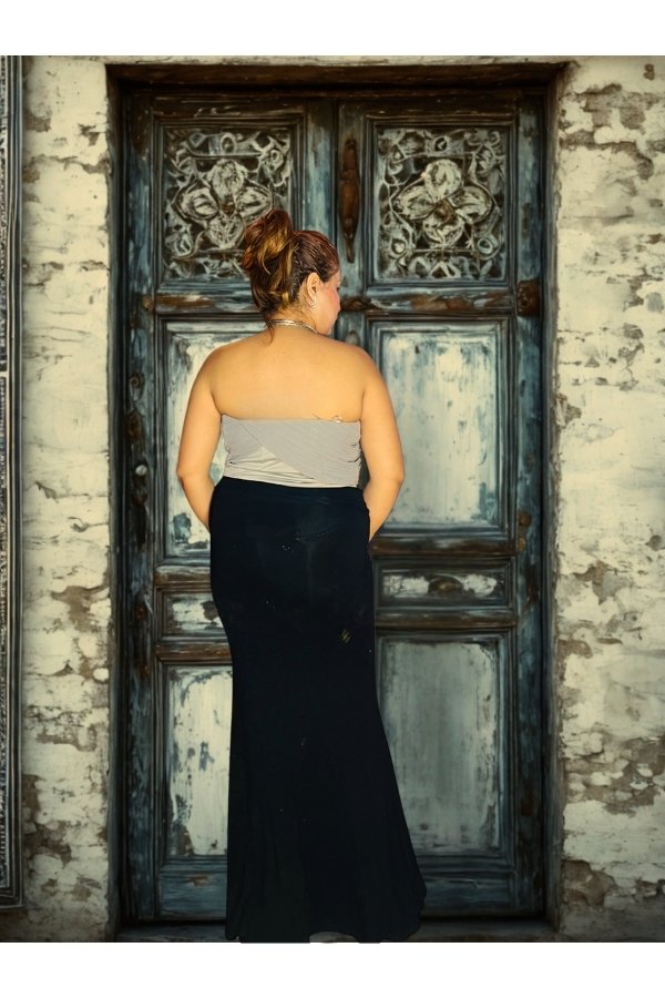 Black corset top with thigh-high slit