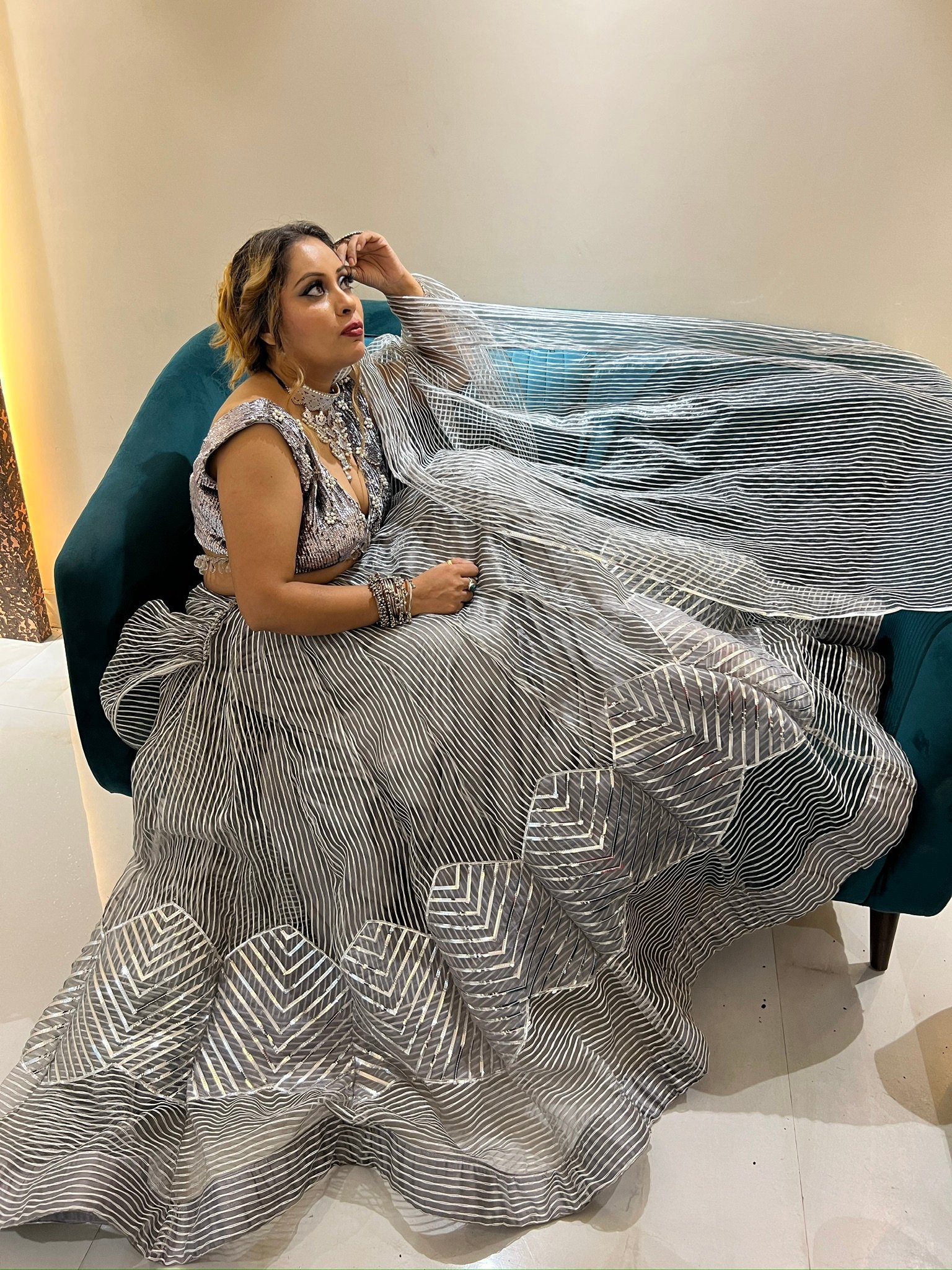 Lehenga: Flowy striped silver lehenga with subtle shine and graceful flare