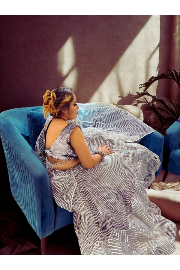 Step into timeless elegance with this Silver Sequin Embroidered Lehenga Set by MElegant. Crafted with luxurious fabric, this designer lehenga features a deep V-neck sequin blouse paired with a flowy striped silver lehenga and a matching lightweight dupatta. The intricate sequin embroidery on the blouse adds a glamorous touch, while the structured lehenga with subtle shimmer makes it perfect for cocktail nights, receptions, weddings, and festive celebrations.